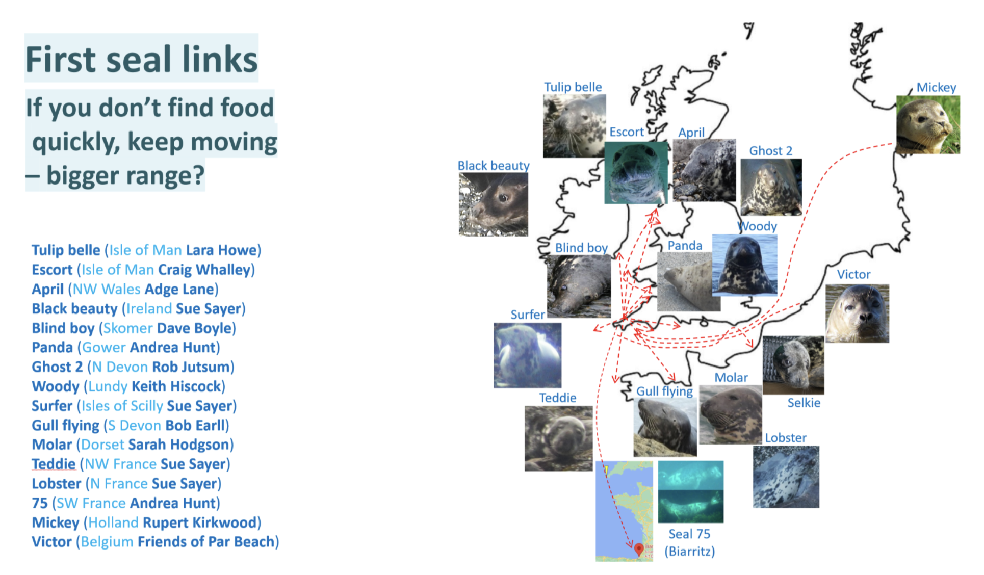 All SRT volunteers know we need help to speed up our manual ID system or even better integrate what we have learned from our manual ID techniques into AI software. This will help avoid false negative IDs (false positive IDs are rare) as well as enable more seal IDs across different site based catalogues building up a more complete and comprehensive picture of seal activity linked to the SW UK. To date, we have been surprised at the mobility of seals previously identified in Cornwall, with seal movements already linking to the Isle of Man (450km to the north); SW France (800km to the south); Holland (650km to the east) and NE England (1000km away).