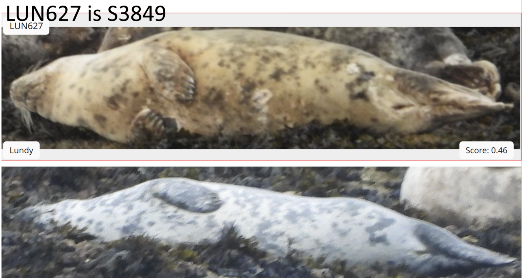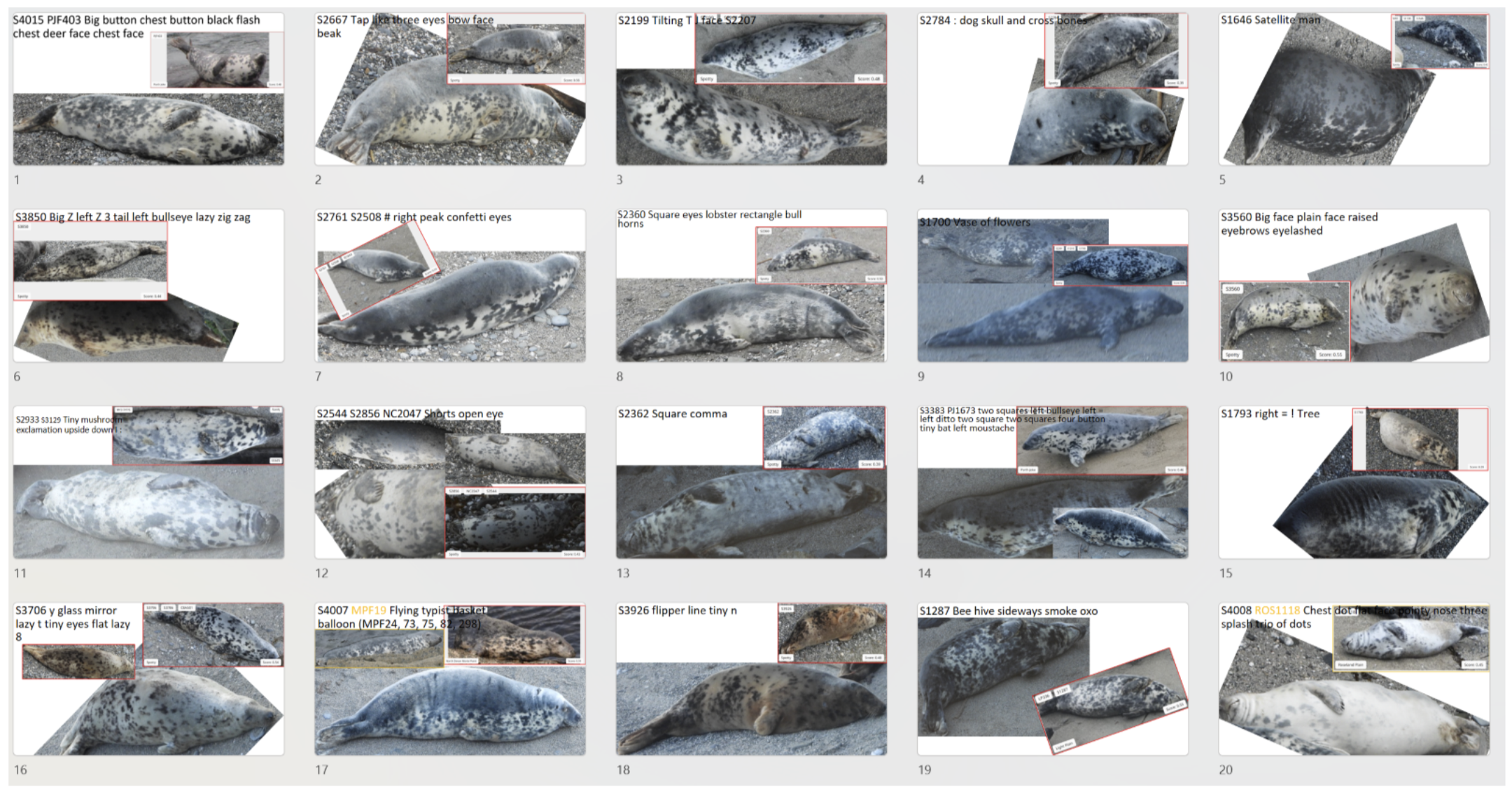 Example matches found with Seal Match (red border) and survey photos (no border)